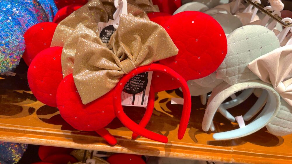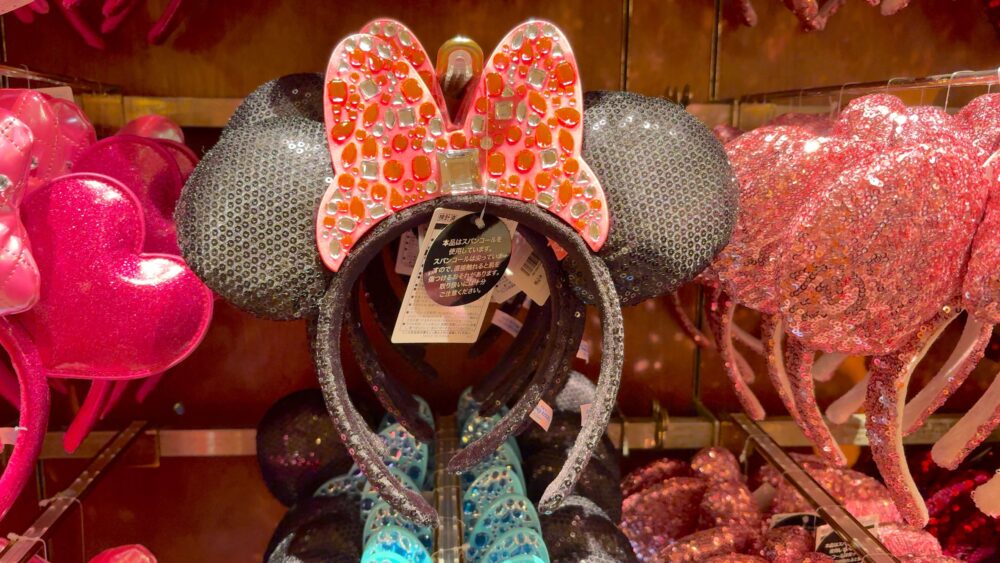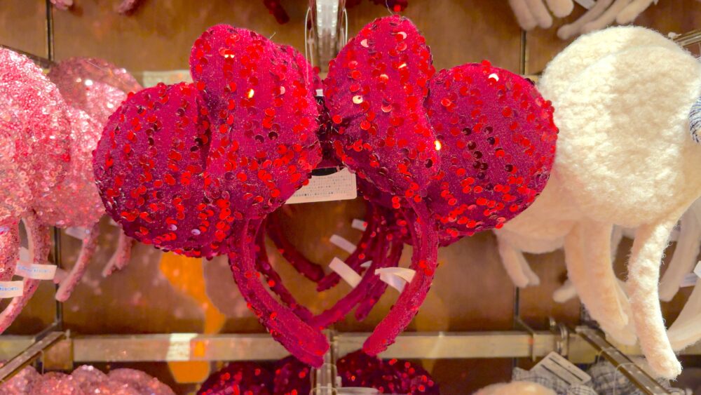 赤のミニーちゃんリボンがスパンコールになっているカチューシャ。ファッションのアクセントにも◎