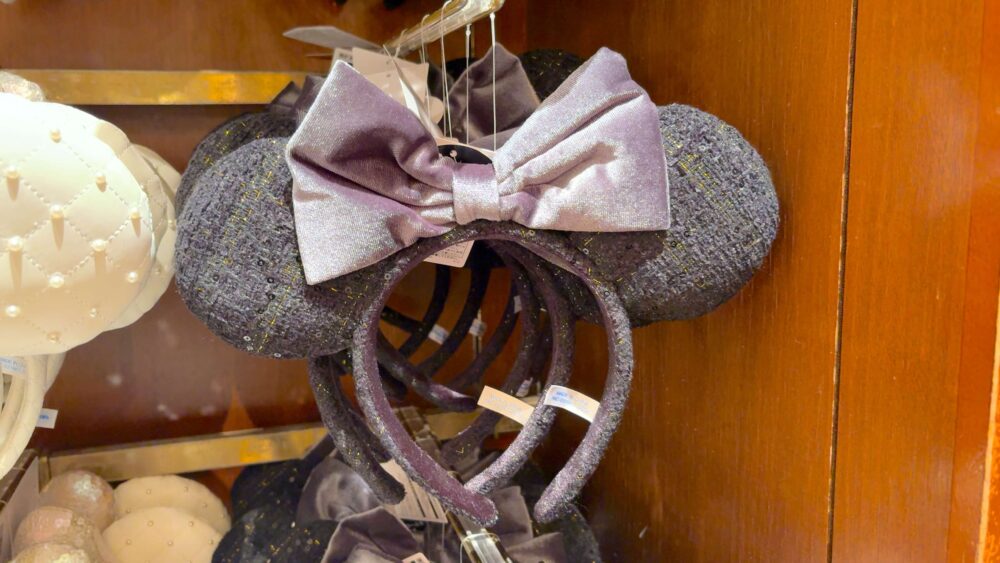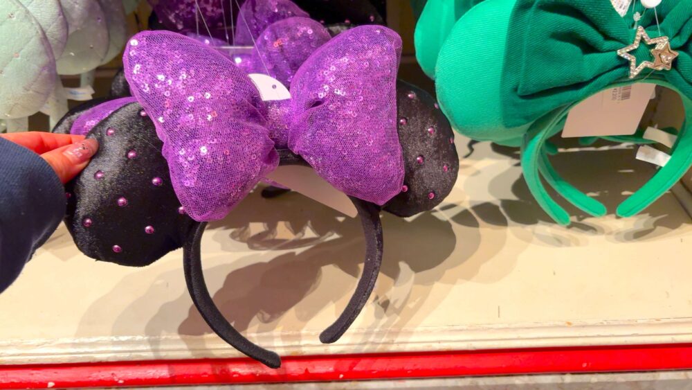 紫色のリボンがスパンコールになっているカチューシャ。ハロウィンやヴィランズコーデに良さそう!